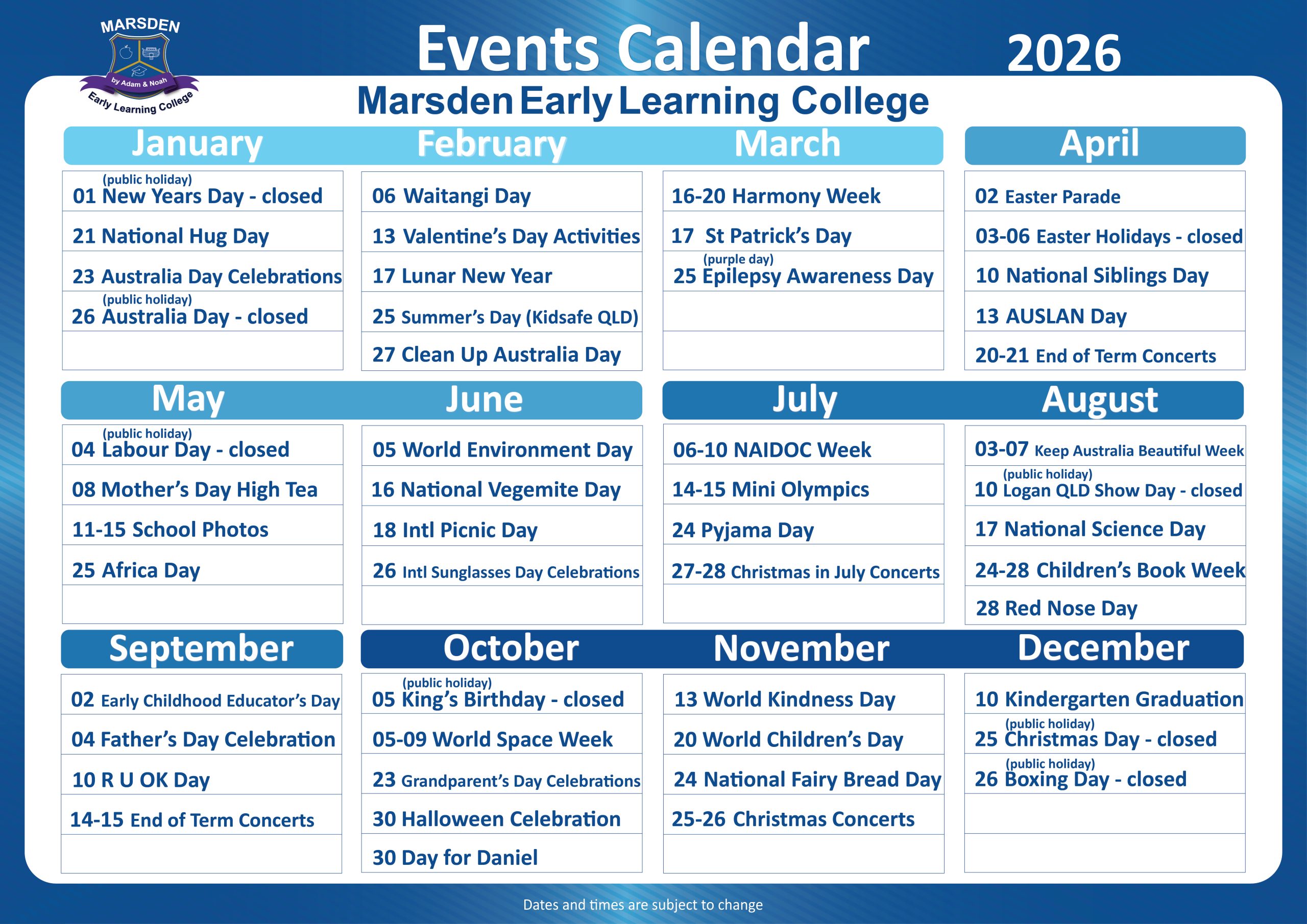 We foster children’s well-being by supporting families, respecting their culture, knowledge and community, aiming to build strong connections and consistency among all aspects of the child’s world. We welcome family input into our program and encourage all families to participate. Marsden Early Learning College recognises significant community events and actively seek inclusion in these.