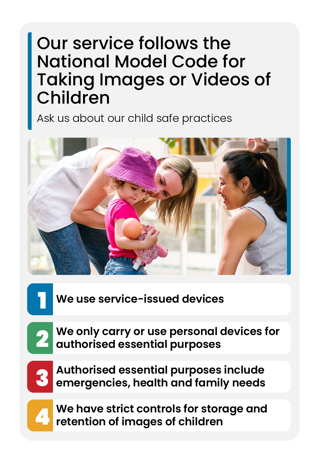 Our highly trained and dedicated educators understand that play is essential in shaping cognitive, social, emotional, and physical development. Our child-centered approach allows children to learn and explore in a safe, supportive, and caring environment—one that fosters positive, responsive, and reciprocal relationships while developing a strong sense of wellbeing and belonging.